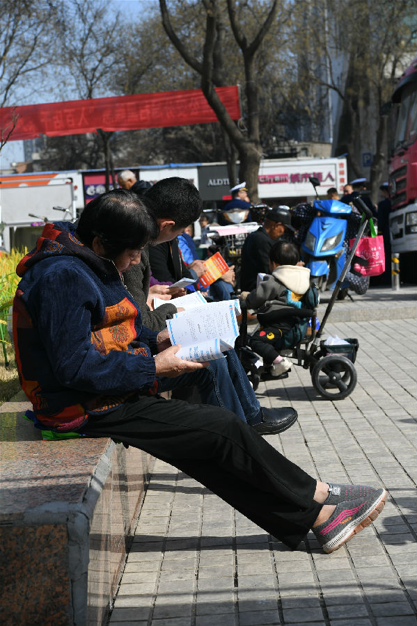 我委成員發(fā)放宣傳彩頁