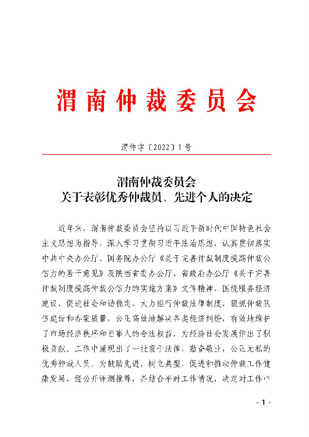渭南仲裁委員會 關(guān)于表彰優(yōu)秀仲裁員、先進個人的決定