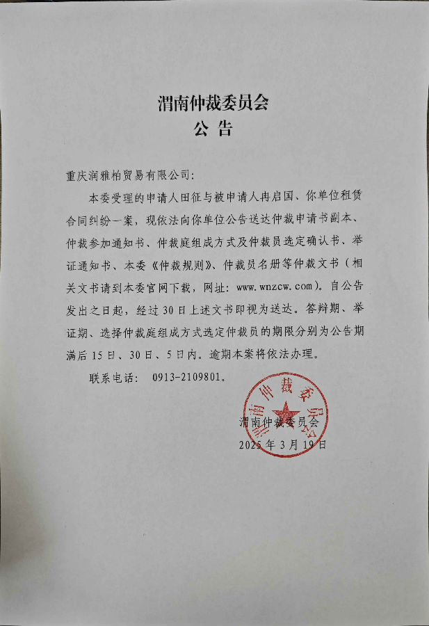 重慶潤雅柏貿(mào)易有限公司、冉啟國與田征租賃合同糾紛案公告
