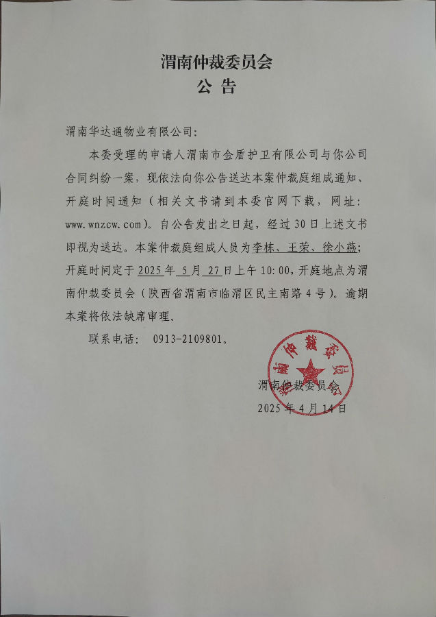 渭南華達(dá)通物業(yè)有限公司與渭南市金盾護(hù)衛(wèi)有限公司合同糾紛案公告