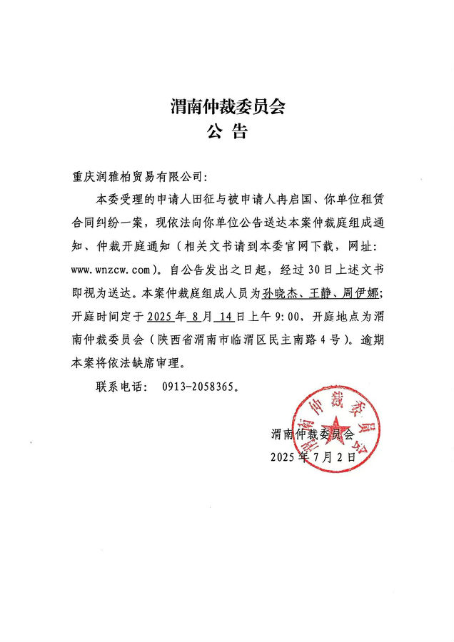 重慶潤雅柏貿(mào)易有限公司、冉啟國與田征租賃合同糾紛案公告
