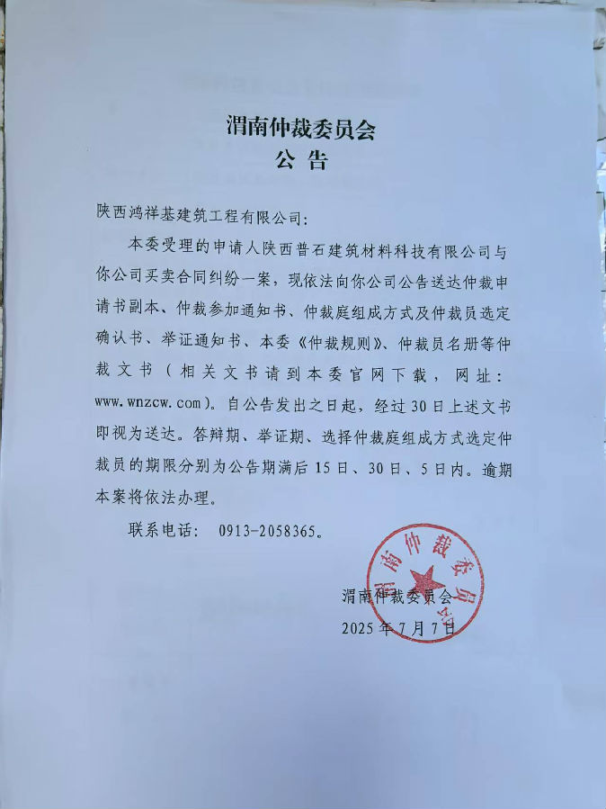 陜西普石建筑材料科技有限公司與陜西鴻祥基建筑工程有限公司買賣合同糾紛案公告